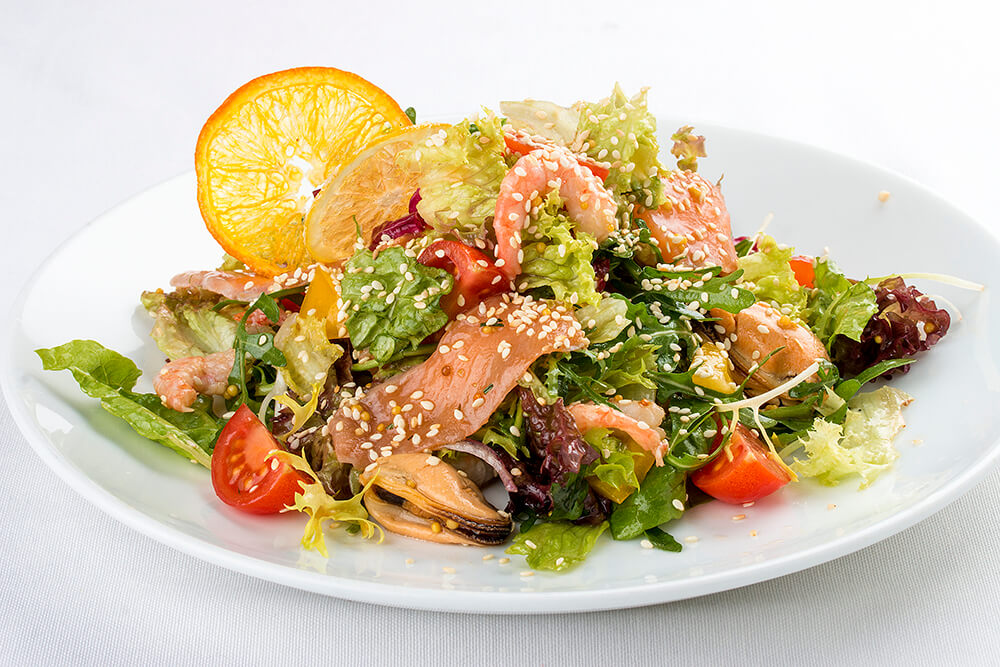 - Микс из семги и морепродуктов на сочном листе салата 250 199 грн