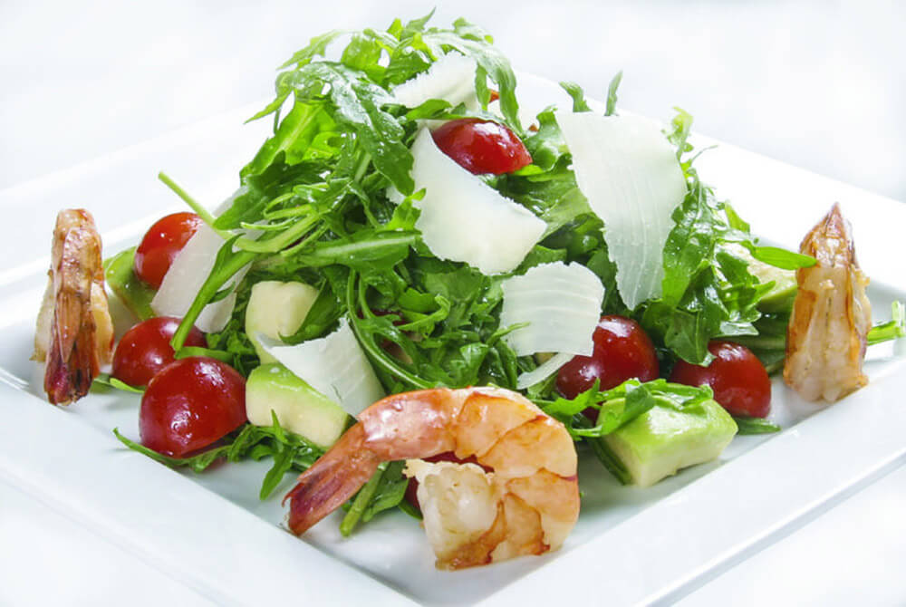 - Руккола с авокадо, креветками и сыром пармезан 170 209 грн